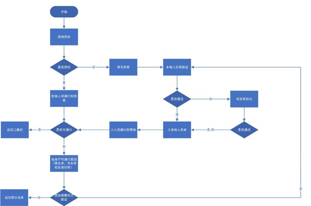 · 后台管理平台:校友数据库(对接学校校友会数据)、权限管理模块(动态配置通行权限)、数据分析与报表系统(统计出入数据、生成可视化图表)。
