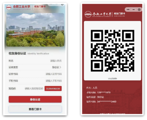 线上预约:校友通过合肥工业大学校友会小程序提交进校申请,系统自动核验并生成通行码二维码。