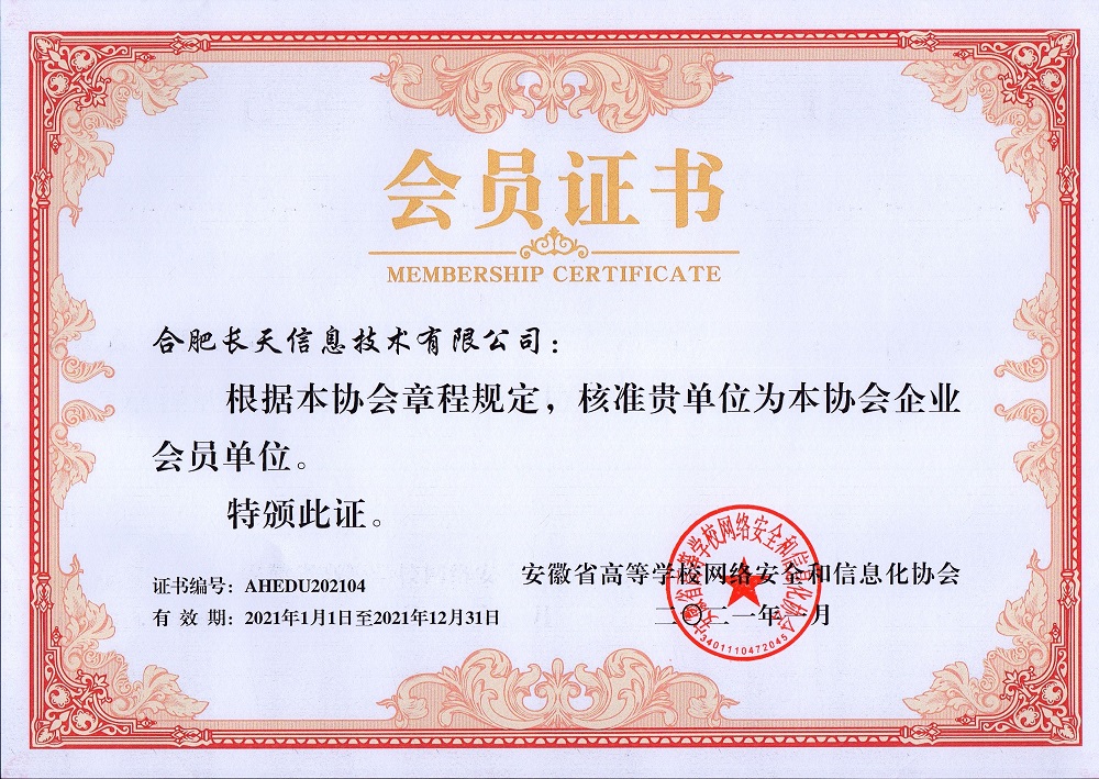 合肥长天信息技术有限公司荣获安徽省高等学校网络安全和信息化协会企业会员单位!