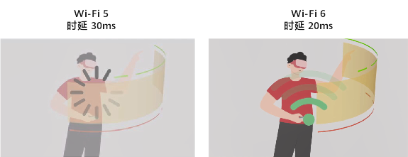 在低时延场景,例如VR/AR-互动操作模拟、全景直播、互动式游戏、沉浸式会议、高清无线投屏等,Wi-Fi5的30ms时延已经无法满足需求,而Wi-Fi因为引入了OFDMA和空间复用技术BSS Coloring,令时延降低至20ms。